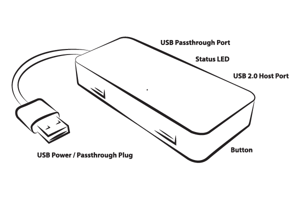 The Signal Owl is powered from the USB-A Male pigtail, while data and power are passed through to its USB 2.0 port closest to the pigtail. For example, with a keyboard or mouse plugged inline between this USB pass-through port and the pigtail connected to the target computer, the Signal Owl will not enumerate as a device on the operating system - only the keyboard or mouse will.